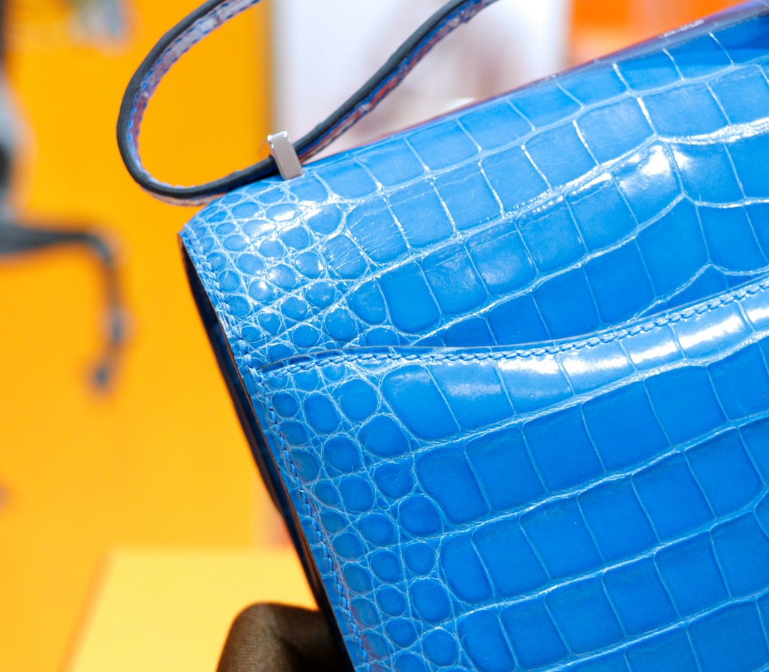 Hermès(爱马仕)Constance 空姐包 伊兹密尔蓝 亮面鳄鱼皮 银扣 19cm 2021年6月6日 0 爱马仕包包官网 Constance Constance 18CM 皮料 鳄鱼皮 Constance空姐19cm亮面伊兹密尔蓝鳄鱼皮银扣 对自己好一点,买只鳄鱼皮 重要场合搭配都非常有面子,永远经典