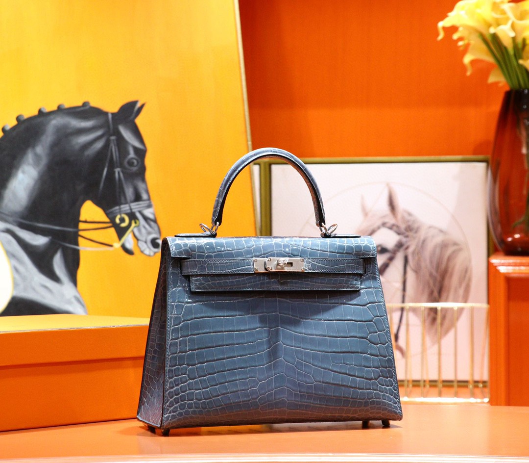 Hermès(爱马仕)Kelly 凯莉包 牛仔蓝 亮面鳄鱼皮 银扣 28cm